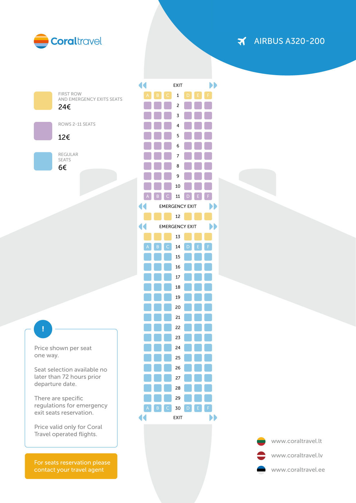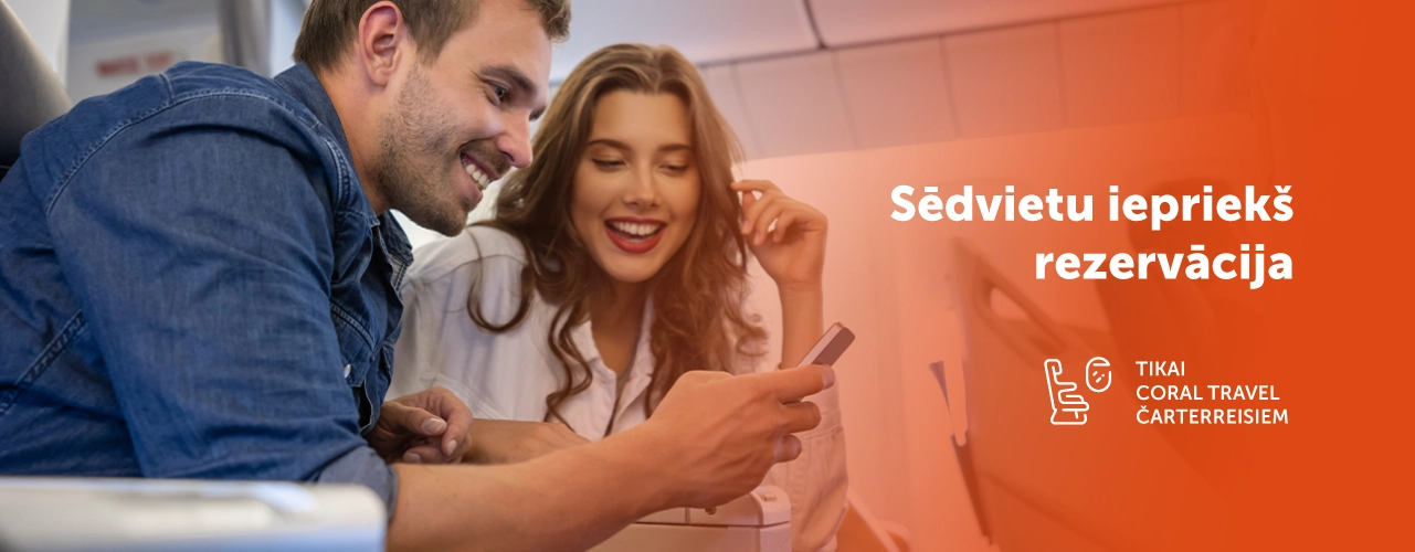 - Ja ceļojumu rezervējat www.coraltravel.lv mājaslapā vai Coral Travel Latvia tirdzniecības birojā, lūdzu, sazinieties ar mums: pa tālruni +371 20 370375 vai e-pastu - celojumi@coraltravel.lv Lūdzu, ņemiet vērā, ka sēdvietu ir iespējams rezervēt ne vēlāk kā 72 stundas pirms izlidošanas dienas.